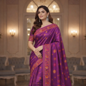2,500.00৳Color: Deep Maroon / Burgundy. ​Fabric: High-quality Soft Half-Silk. ​Design: Bold "Kalka" motifs in Red thread and Golden Zari. ​Occasion: Perfect for bridal parties, evening receptions, and grand festivities. ​Origin: Traditional Tangail Weaving. -