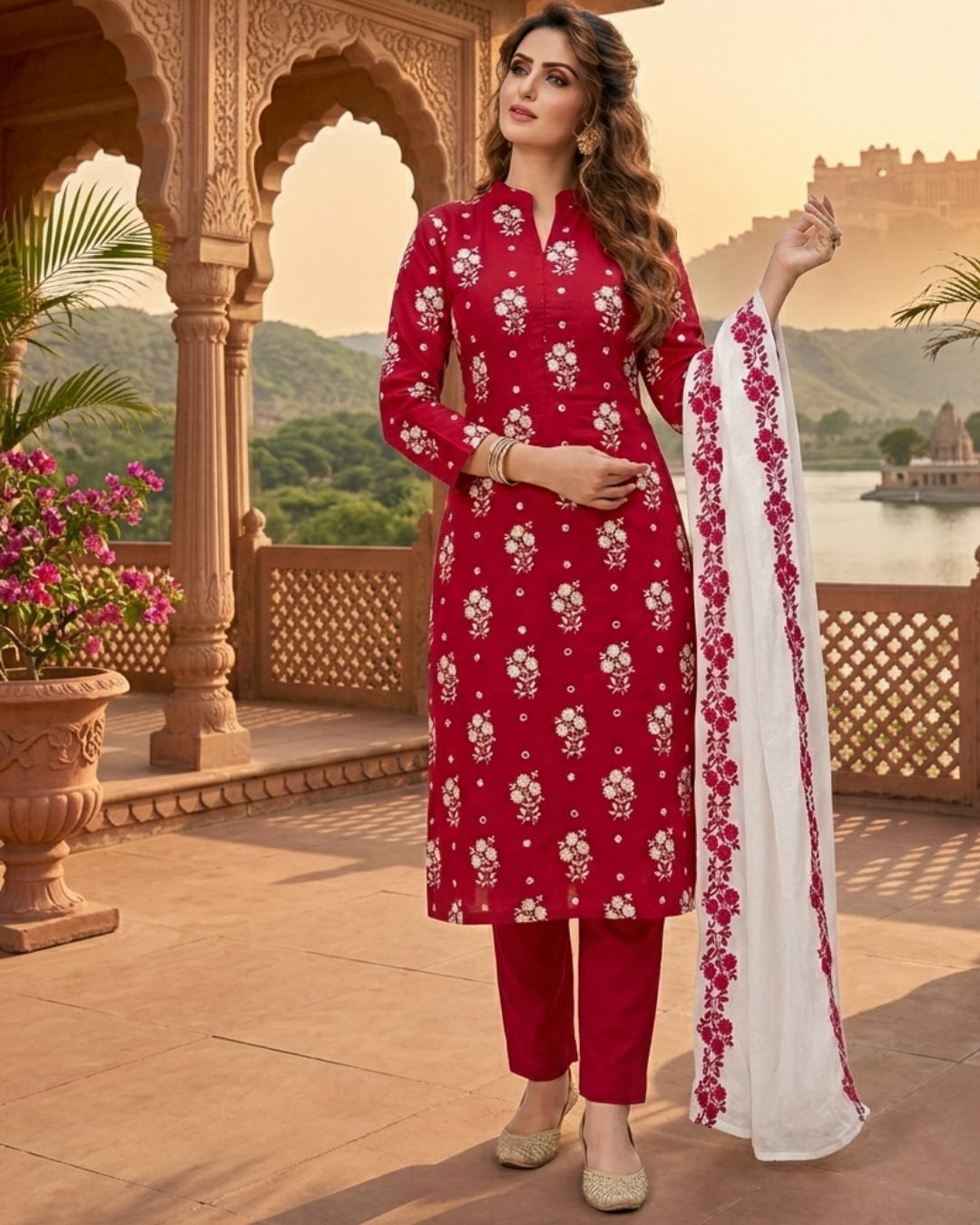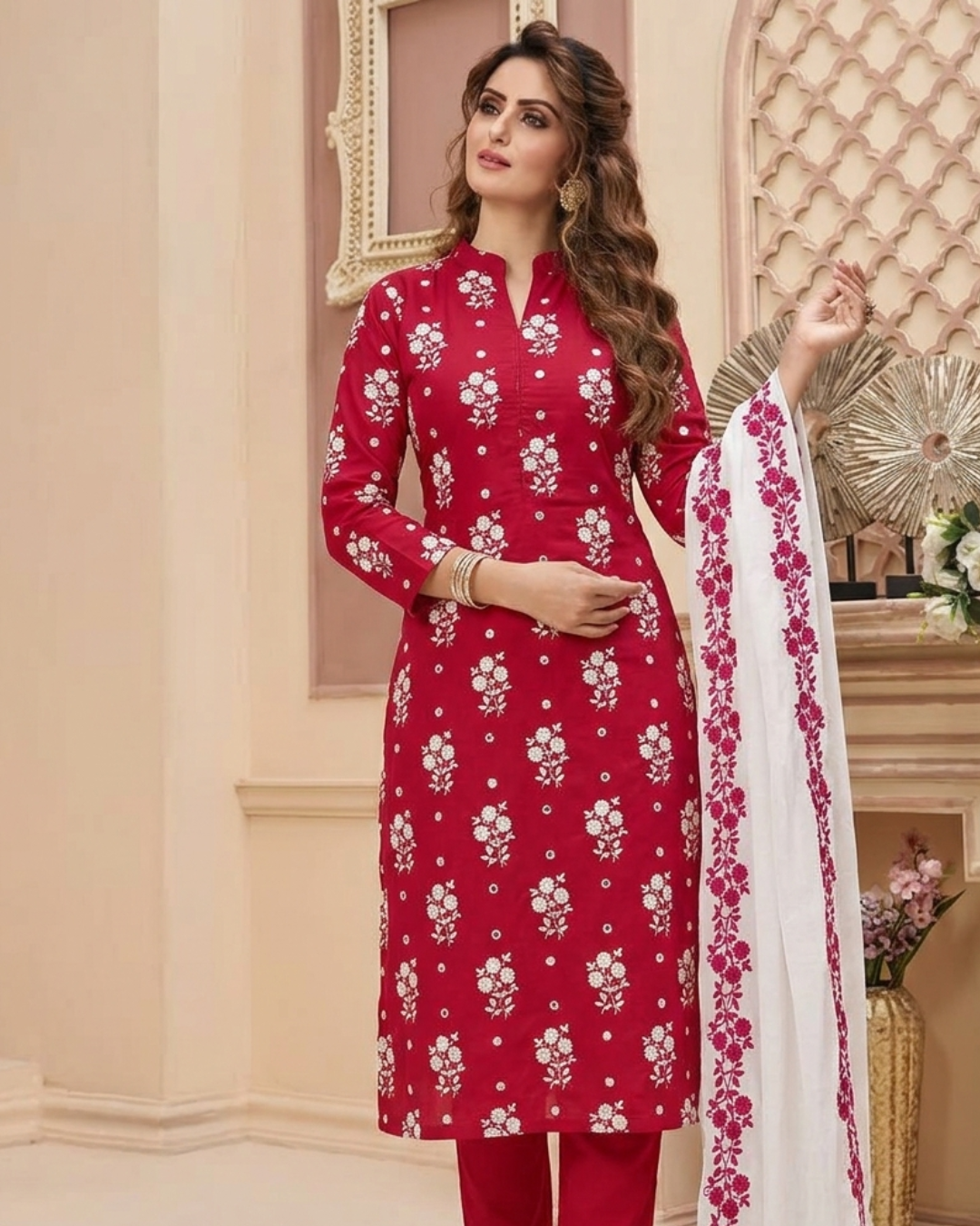 Contrast Styling: The set includes a matching dupatta with embroidered borders and a white salwar featuring a heavy, vibrant red floral border at the bottom to create a striking visual balance.