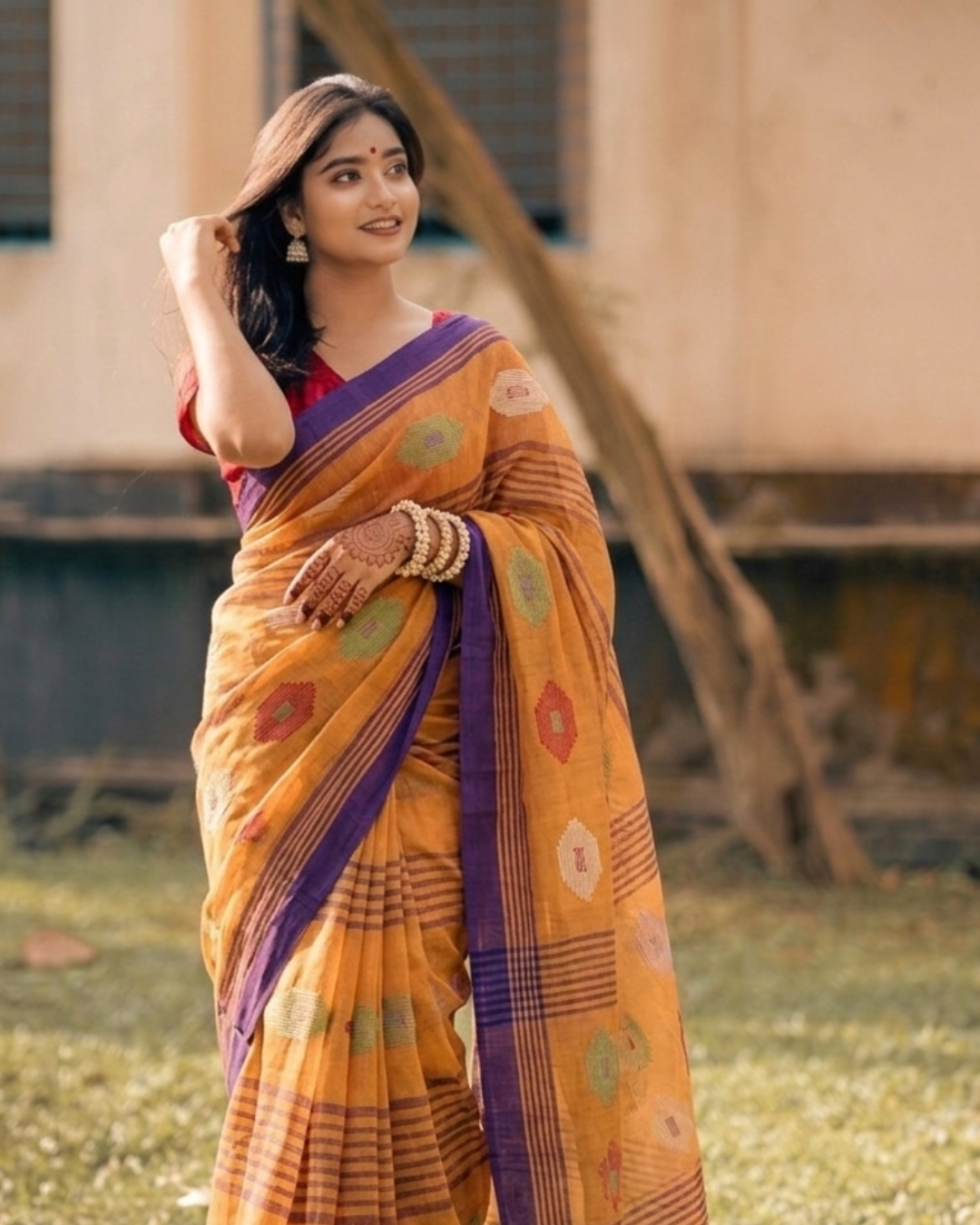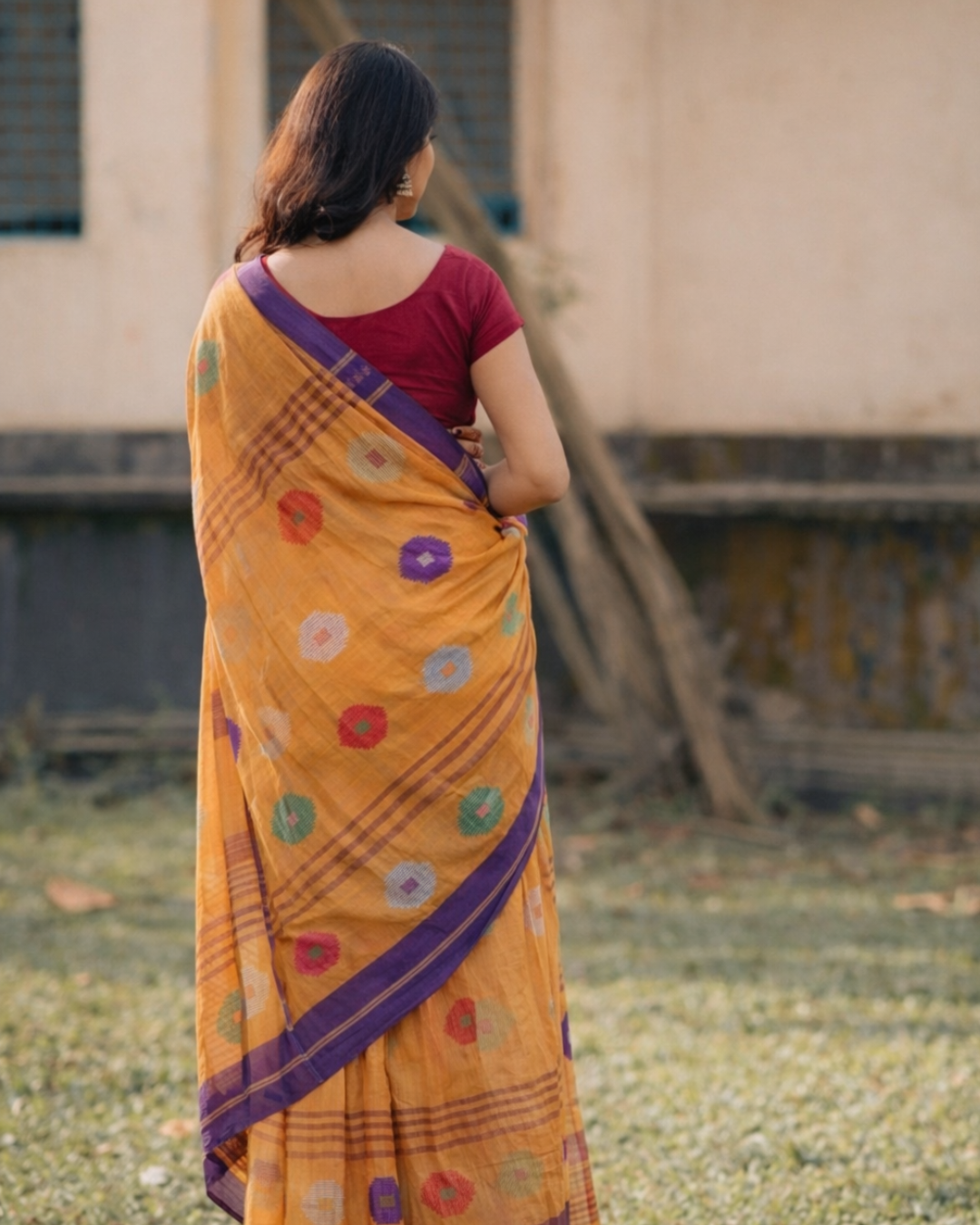 Make a bold statement with this stunning Golden Yellow Manipuri saree. Known for its distinct weaving style, this saree features intricate geometric motifs across the body and a deep-toned border for a classic finish. Whether it is a Gaye Holud ceremony or a traditional festival, the vibrant hue and ethnic craftsmanship make this saree a must-have for your ethnic collection.